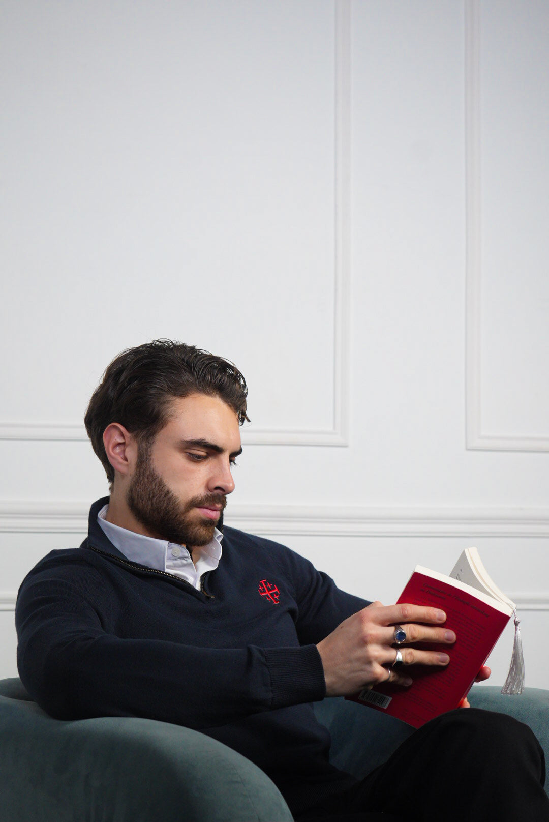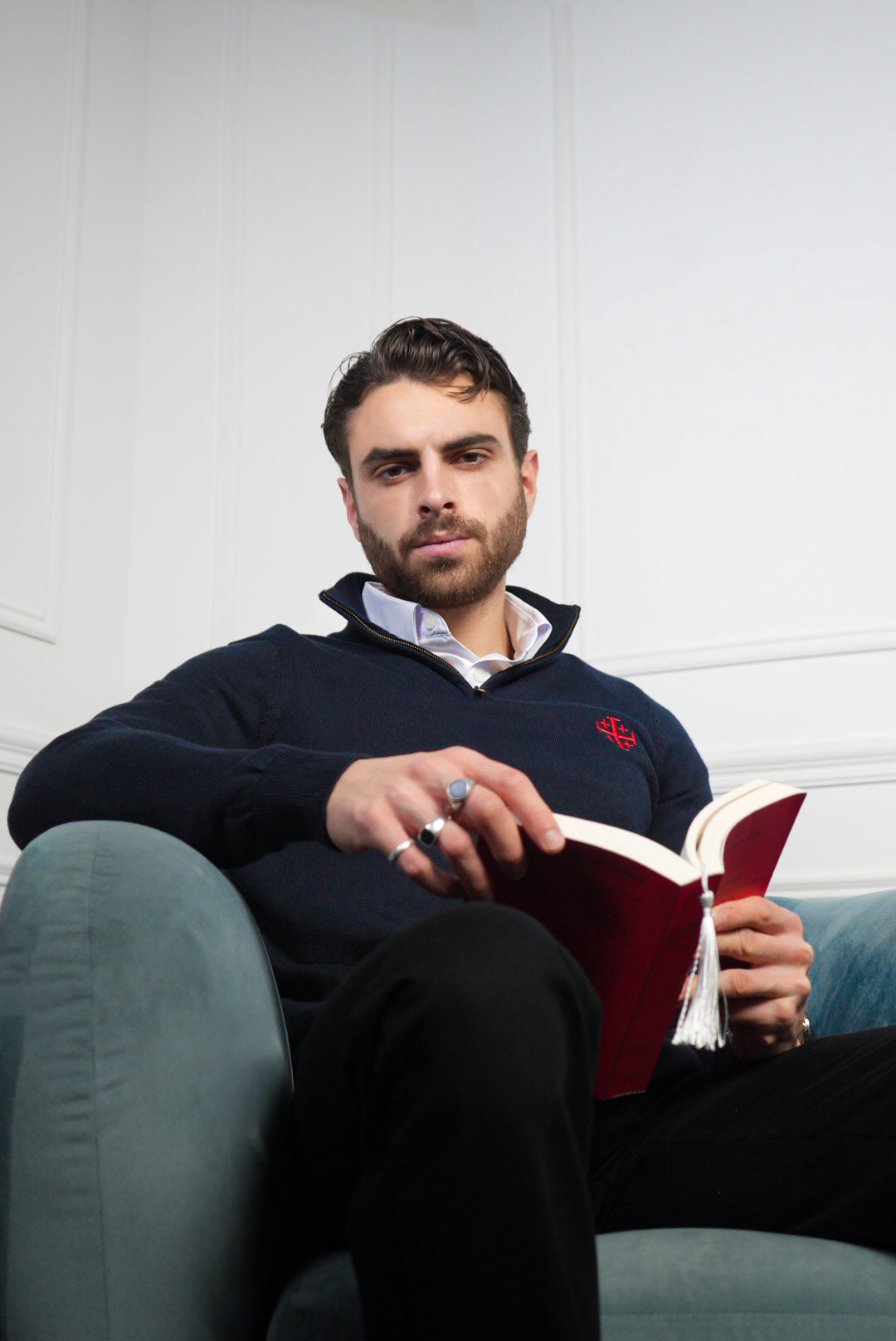 Disponible en bleu, noir et gris chiné, ce pull est une base idéale à personnaliser avec le motif de votre choix.